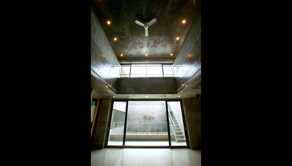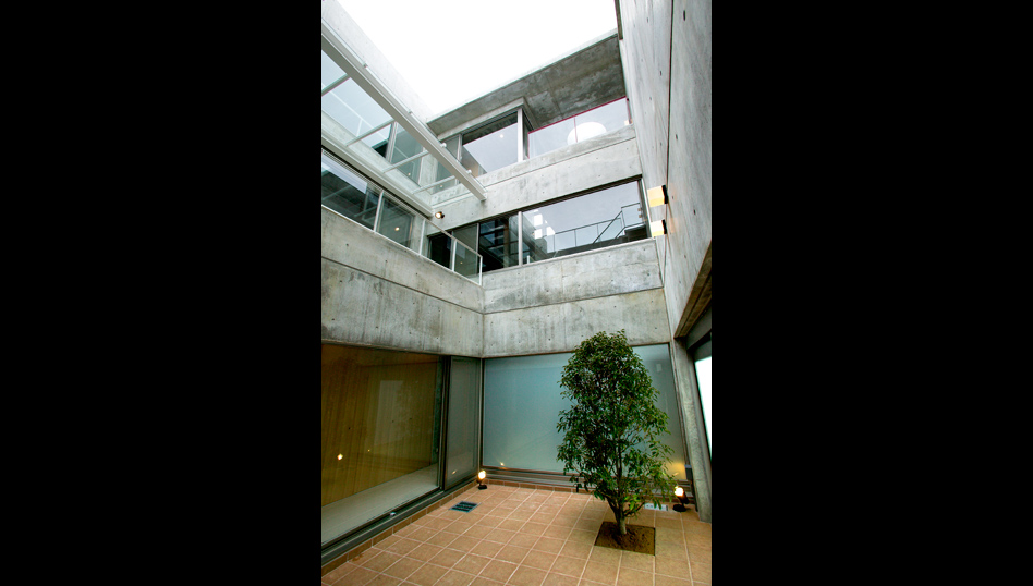 研ぎ澄まされた近代的な空間の中に外部の視線を遮断しつつも太陽の光を内部に導く中庭に面して吹き抜けを持つリビングを中心とした生活空間を配置することによって、