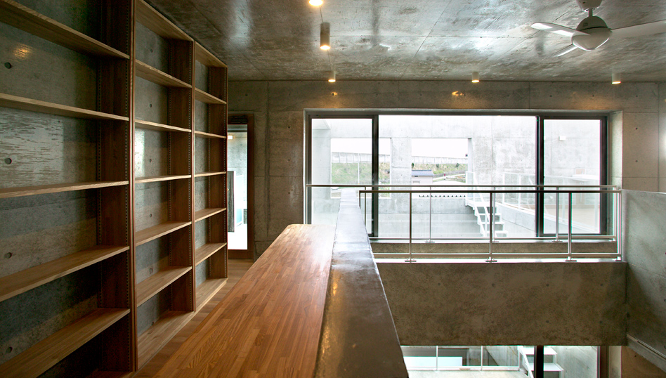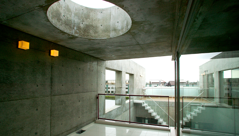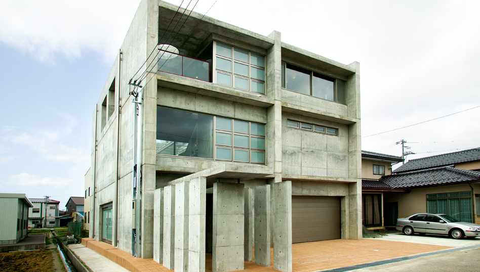 金沢市北部の田園地帯に建つこの住宅は、内外ともコンクリート打放しの中庭と吹き抜けのリビングを中心に家族5人と犬2匹が仲良く暮らして欲しいと願った家です。