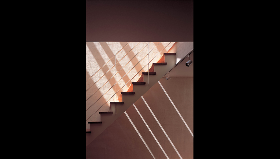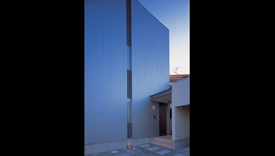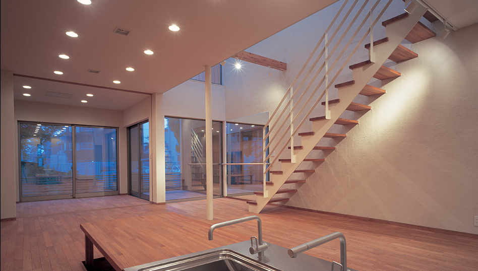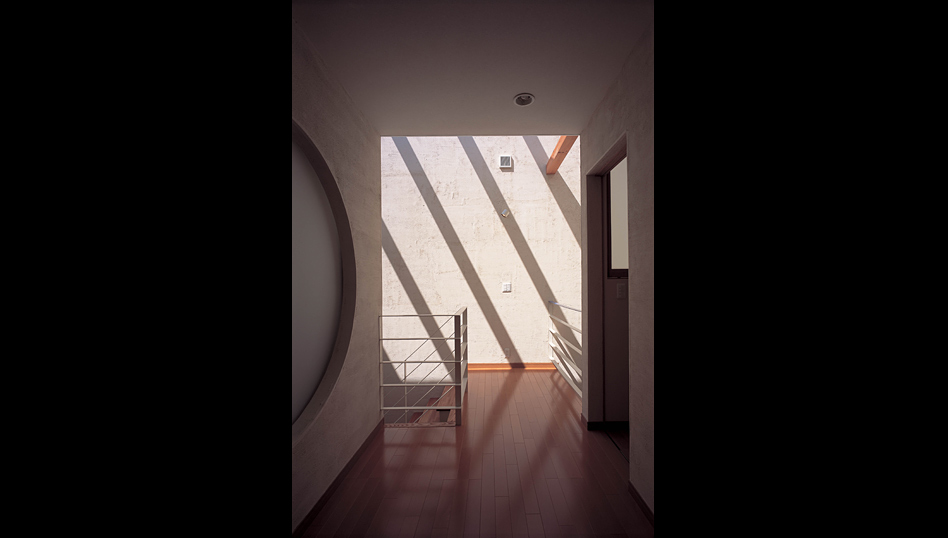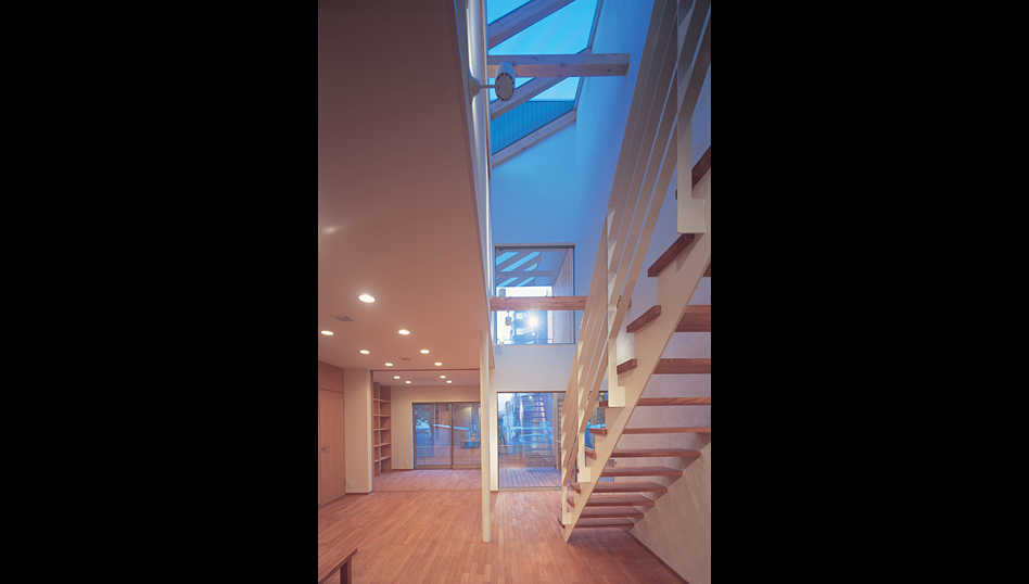この住宅は、金沢市内の密集した住宅地に建っている。 階段ホール上部の屋根全面のトップライトからの光を室内に取り入れ、近隣の影響を受けることなく、常に空を感じながら生活のできる家である。 1階は光が降り注ぐホールに連続して居住空間が配置されており、家族の生活はそこを中心に展開される。