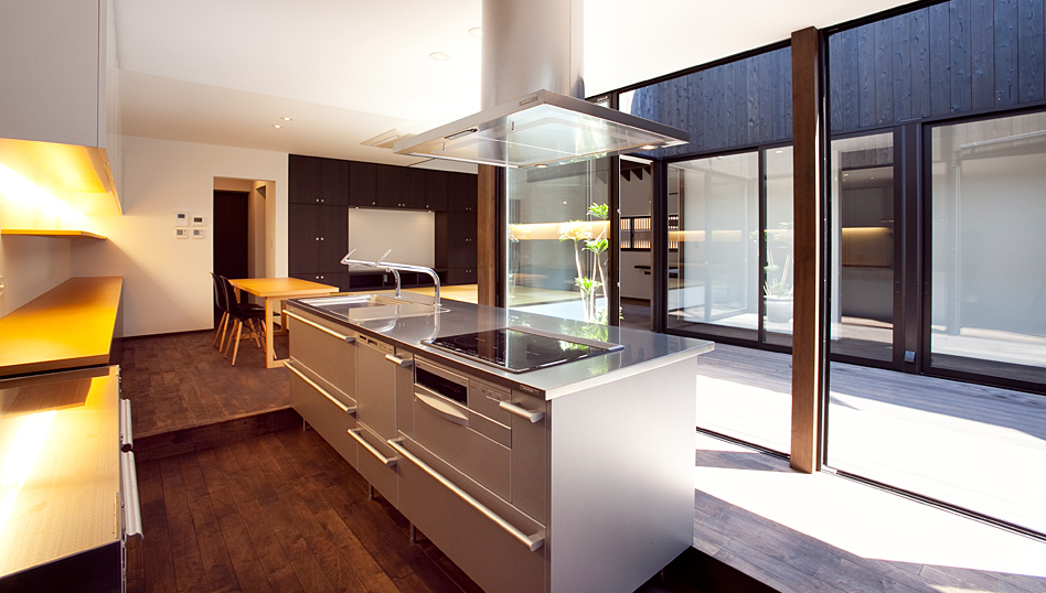 中央に取った大きな中庭をぐるっと部屋が囲む家多くの来客をもてなす大きな空間がある家。