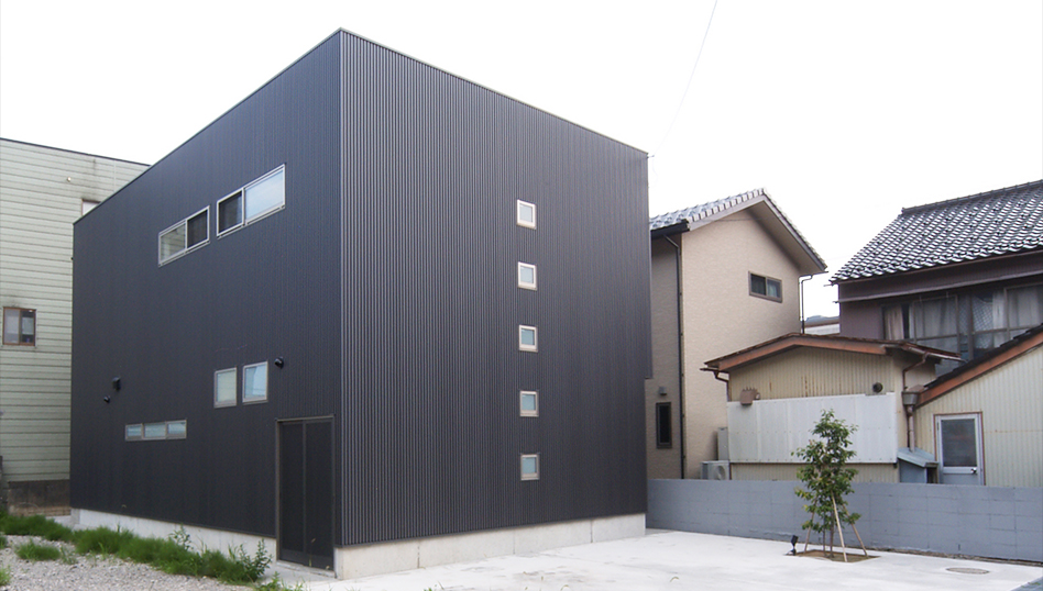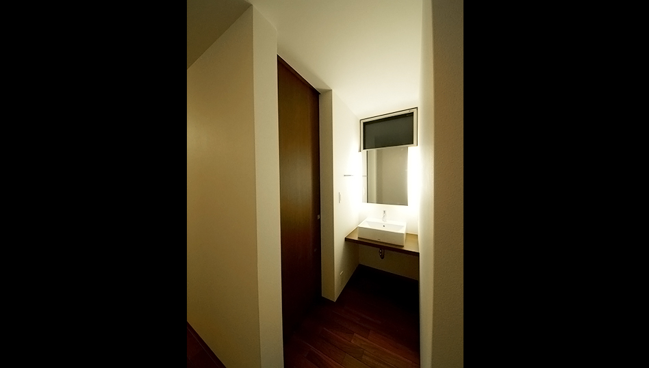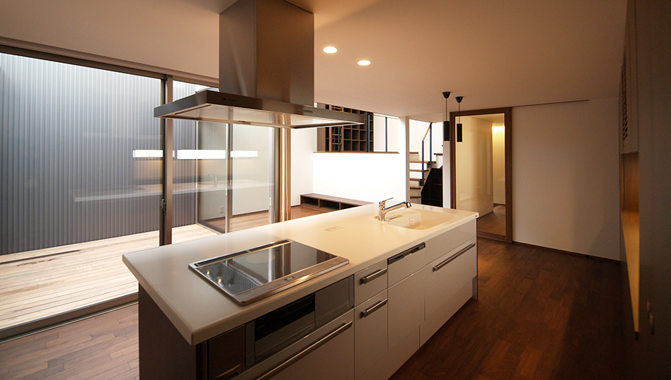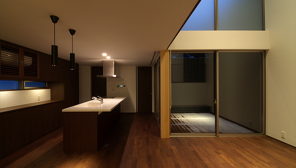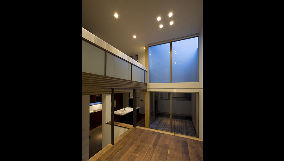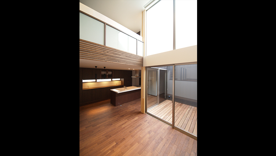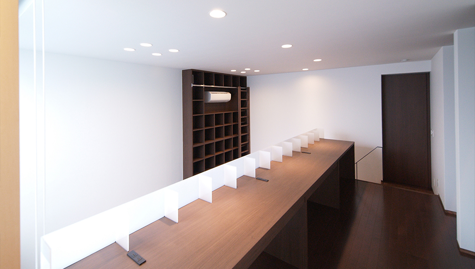 中2階に大きな本棚のある読書スペースを設け、1階と2階の空間を一体化。