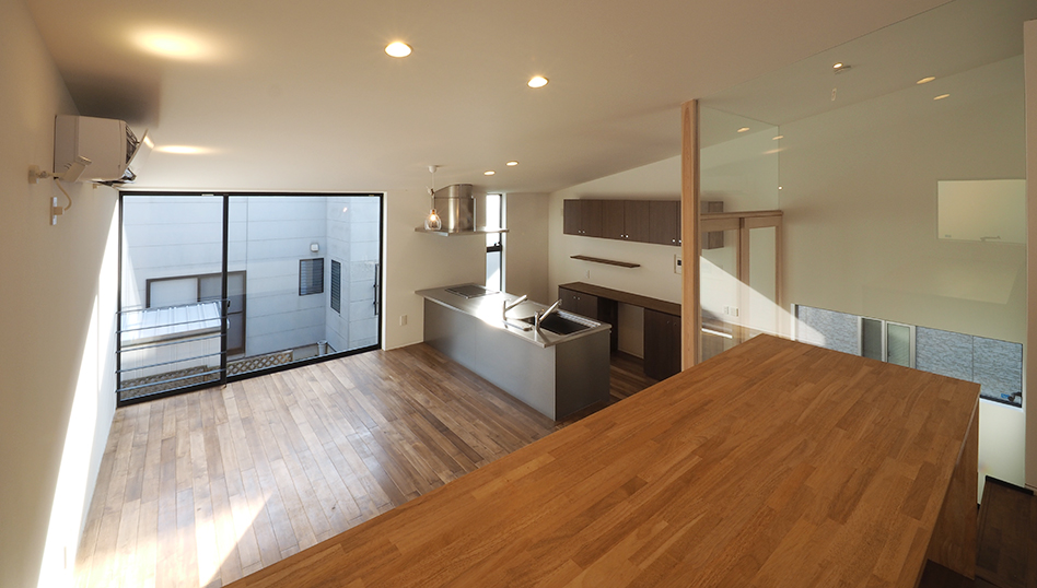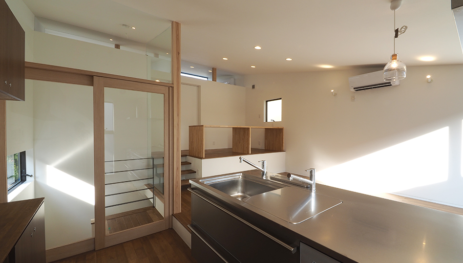 リビング、ワークスペース、子供部屋がスキップフロアでつながる家。
