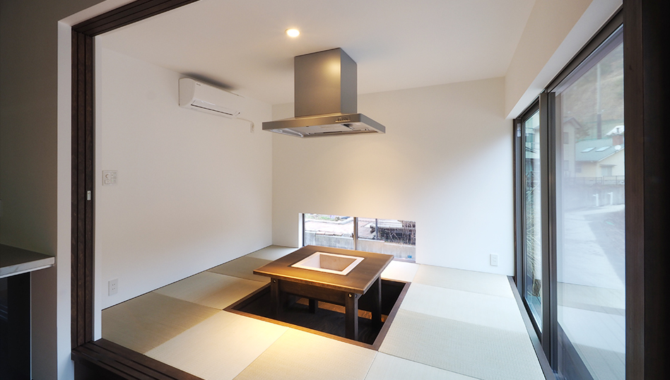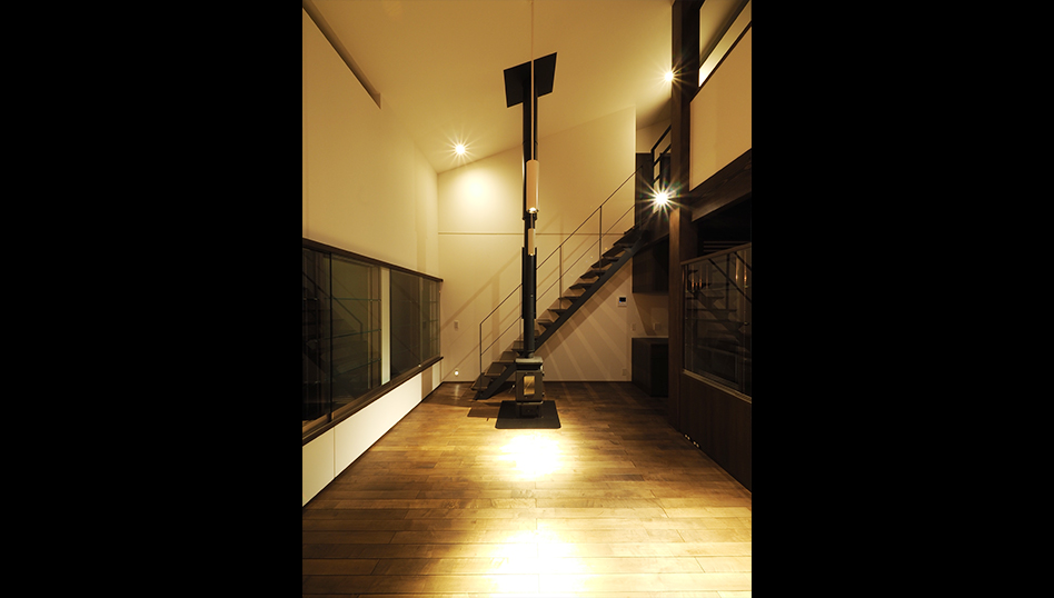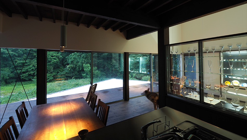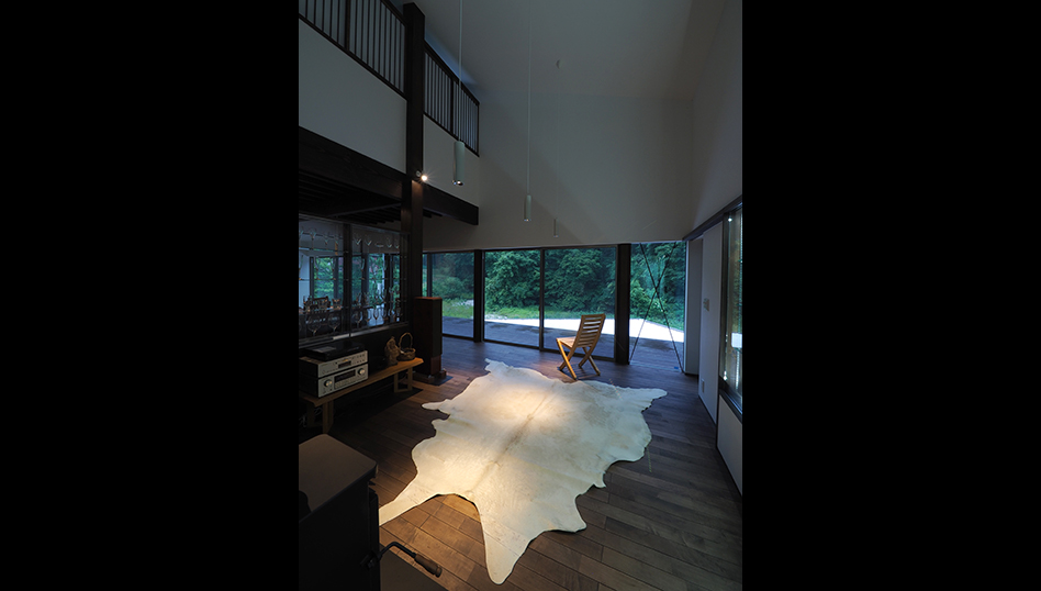 川の流れと木立ちに向けて大きく開いた窓を持つ吹き抜けのリビング。