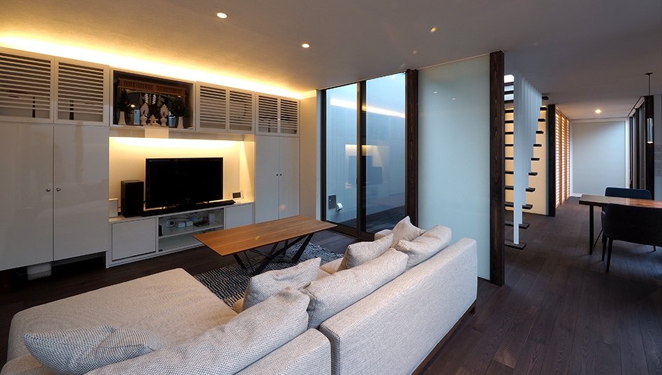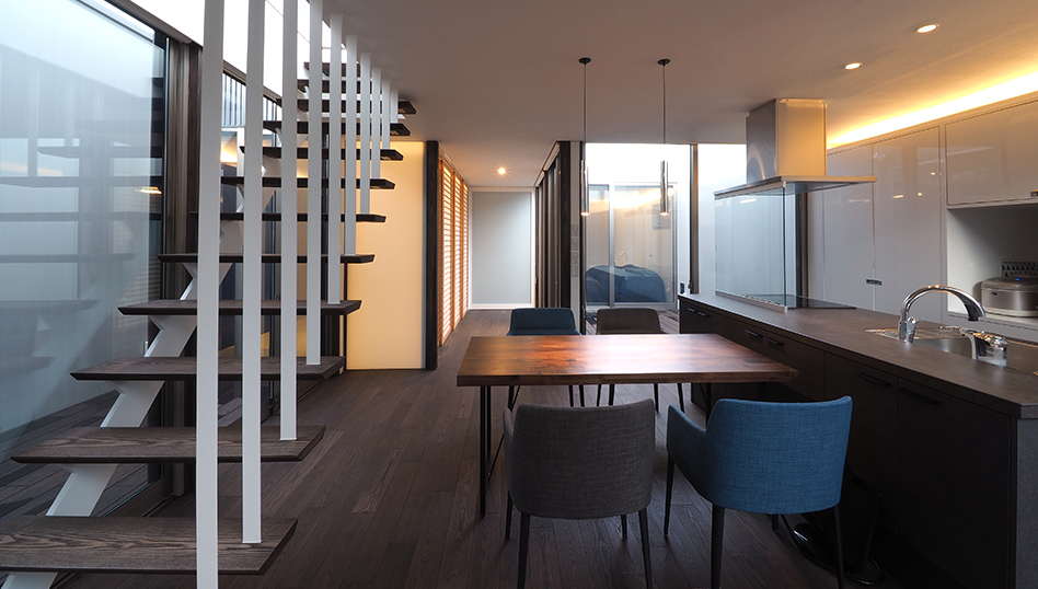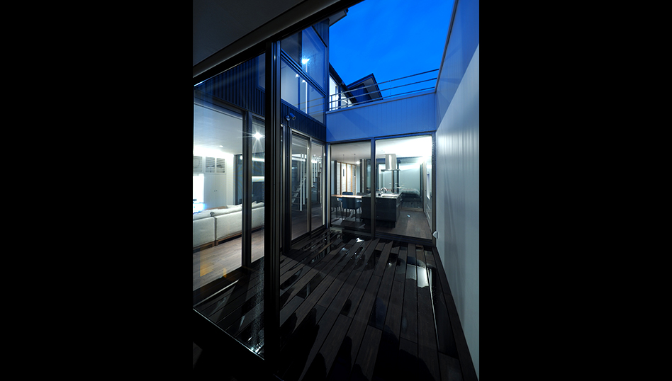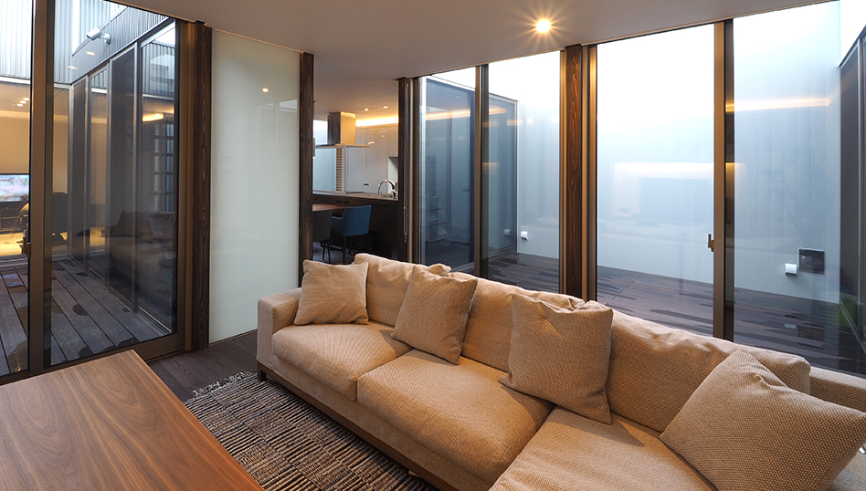 共有のダイニングキッチンを中心に、その回りの中庭を介してそれぞれの個室を配置し一体感を感じながら、明るく生活できる家。